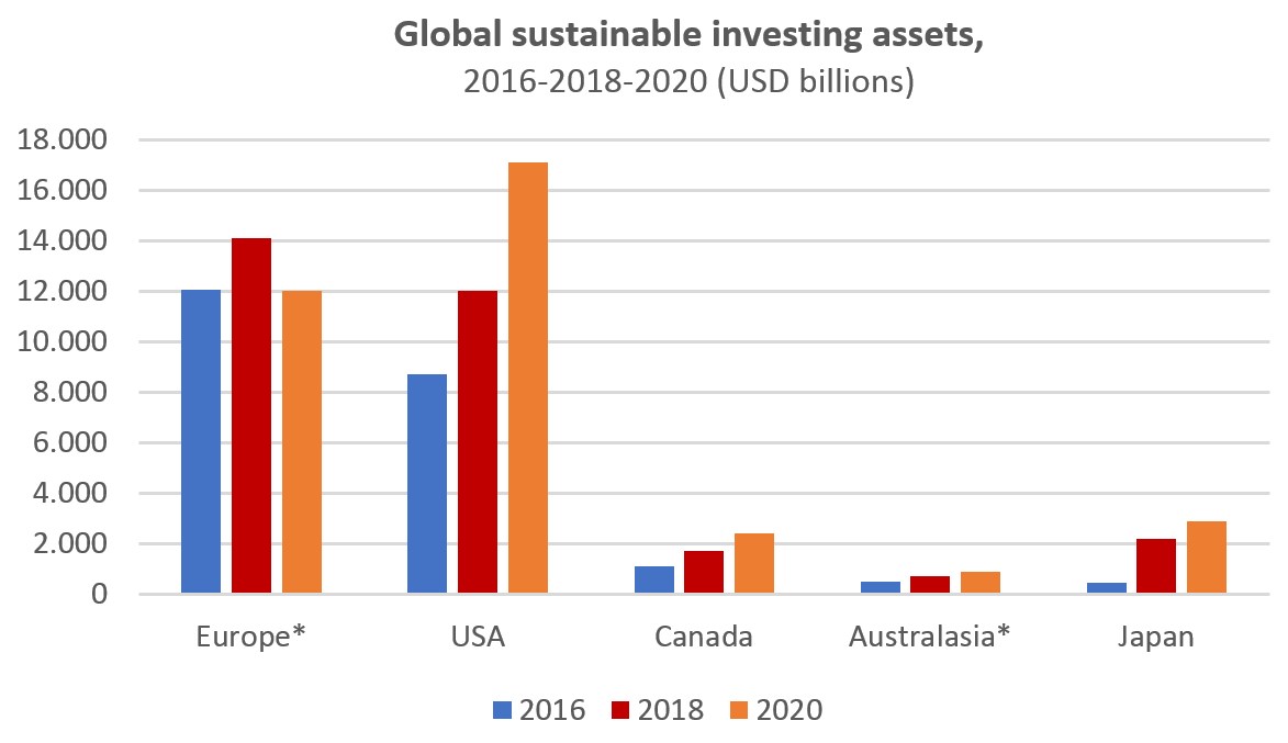 * Note: In Europe and Australasia, the definition of what means sustainable investment has changed.